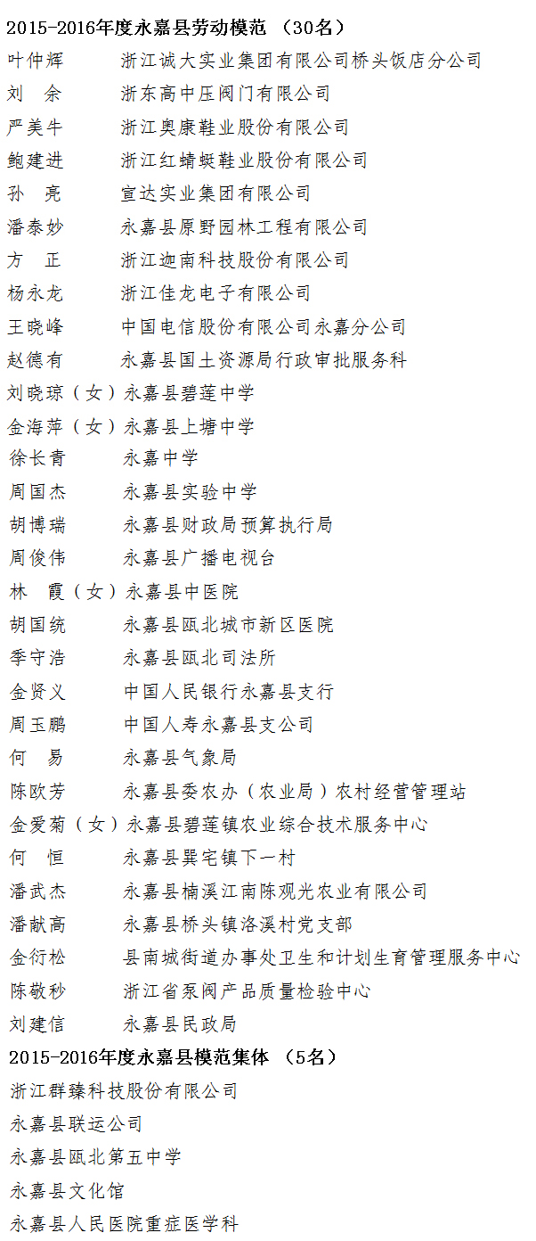 我縣2015-2016年度勞動模范和模范集體推薦名單已經(jīng)縣勞動模范評選委員會審定,現(xiàn)予以公示,接受社會公眾監(jiān)督。公示時間為2017年4月21日至4月23日。若對公示對象有不同意見,請與縣勞動模范評選委員會辦公室(縣總工會)聯(lián)系。反映問題需署實名,客觀公正。聯(lián)系電話:67232197,67222230。傳真:67232107。