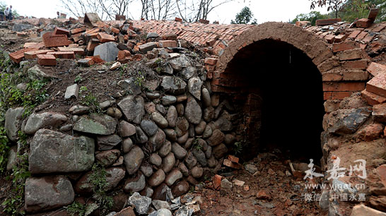記者來到現(xiàn)場時(shí),村民們正在積極修復(fù)中。只見窯體沿山坡15度角而設(shè),平面成方形,中部隆成穹頂,長約60米,寬6.5米,外壁用不規(guī)則塊石壘砌,中挖窯洞,窯室內(nèi)寬2.5米,高至1—1.8米不等,沿山勢遞增。窯體腰部及頂端共挖有四處窯門,以方便搬運(yùn)缸胚及成品,進(jìn)柴口位于灶底部,用磚砌成方形,其上置方形通風(fēng)口。窯就地取材,主要燒制黑釉敞口缸,采用木柴作為燃料,燒制時(shí)間為15-16個(gè)小時(shí),完成后再涼置24小時(shí)后方成品,該窯最多可容1000多只缸胚,燒制完成后銷往附近村鎮(zhèn),作為農(nóng)村的生活用具。