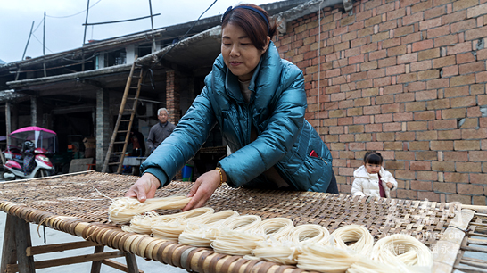 除了加工苦楮豆腐,該村幾乎家家戶戶會制作紗面。你看那一排排面架上的紗面就如一簾簾輕紗,用紗面筷子撩開紗面時,看到的就是古代美女輕撩面紗的場面。因此,古人才會說這是“紗面”,更顯文化味。