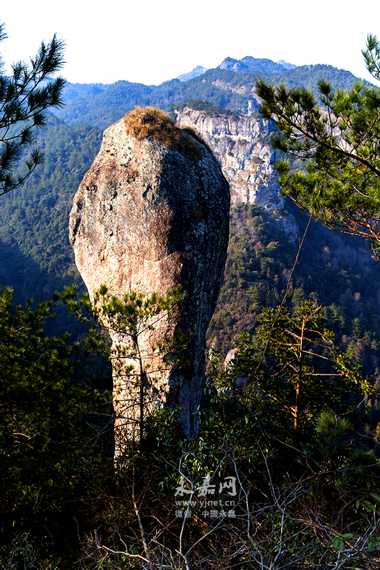 石斑巖也叫船巖,面積大約有2400平方米,周圍都是高不可攀的懸?guī)r峭壁,遠(yuǎn)遠(yuǎn)望去,像大輪船的吃水線。山巖上有一處平地,原建有胡公大殿,后被燒毀,站在玉皇頂,遠(yuǎn)望金溪高峽平湖,碧波蕩漾。這左邊隔陜谷有雨傘巖高聳;右邊隔峽谷有天柱巖如筍長在山坡,惟妙惟肖。