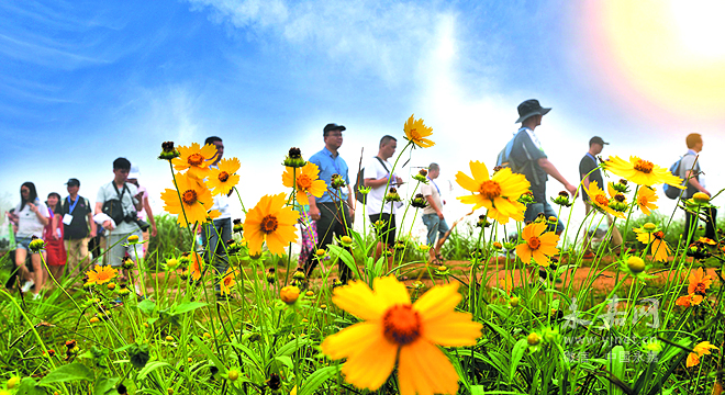 腳下的茶園和身旁的野草顯得粗狂,點綴其間的黃花猶如不甘屈服的生命力在努力張揚自己的個性,下面是碧波萬頃的天湖,如同放大了的鐮刀,它還有一個詩意的名兒藍月亮。頃刻之間,霧氣帶著涼涼的小水滴迎面而來,屏蔽了天湖也屏蔽了遠方,后來的客人就無緣見到它的真容它的美了。