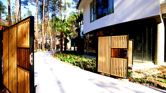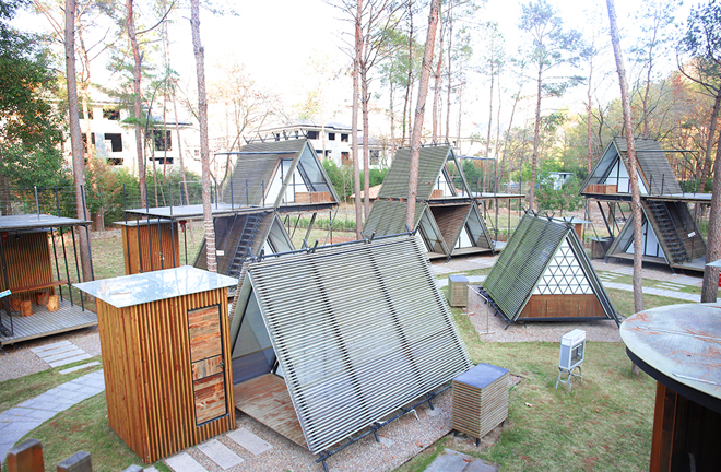 在永嘉書院的松樹林中,所見的便是風(fēng)雅誦·松月民宿。樹屋式建筑頗具特色,后現(xiàn)代風(fēng)格,每個房間都有大大的落地玻璃窗戶,太陽東升西落都可以照得到,配上鳥鳴四起、青山蔥蘢,別有一番天然、靜謐的情趣。