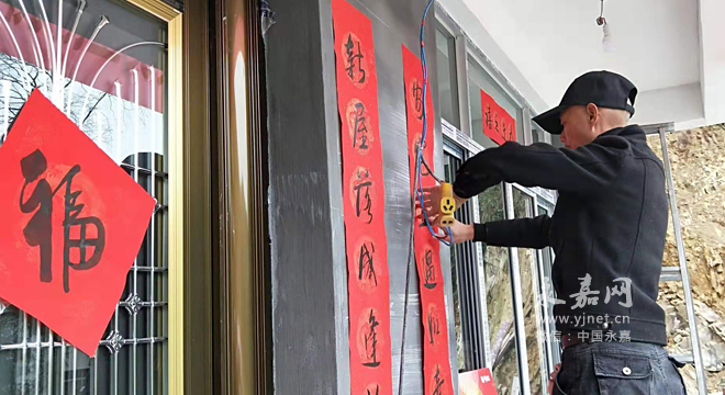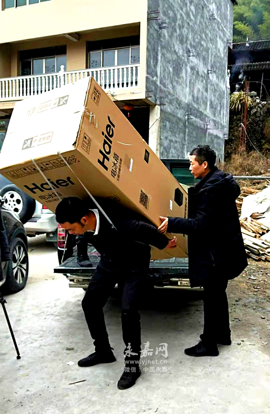 義工們到他家里開始忙了起來,貼對聯(lián),掛紅燈籠,鋪被子,為楊玉英打扮新房。在新房門前貼上一副大紅對聯(lián):“新居落成逢新歲春風送暖發(fā)春華”,表達大家的美好祝愿。接著,隨行的隊員們在新房前微笑著合影留念。楊玉英撫摸著一件件嶄新的家電,激動得熱淚盈眶:“我75歲了,還沒有看到過這么好的電視機,也沒有用過洗衣機!