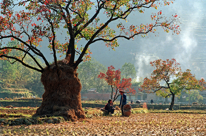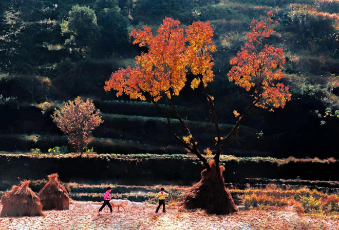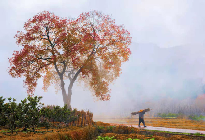 李昌賢老師認(rèn)為,烏桕最美的時(shí)候,是在秋收冬種時(shí)期。秋收以后,一棵烏桕孤立在田園,桕葉紅透、艷麗。樹(shù)上堆著稻草,形似草球;亦或掛著番薯藤、玉米藤,充滿著生活氣息。夕陽(yáng)西照,山巒起伏,隱約可見(jiàn),真所謂秋光巒影,風(fēng)光無(wú)限。