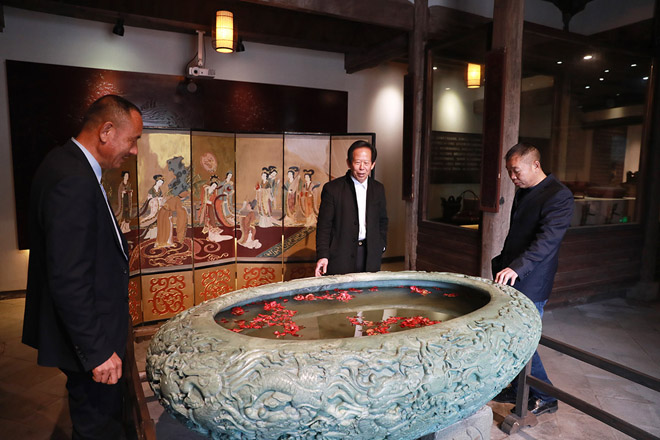 除攝影器材館,楠峰公司籌建的民俗館也進(jìn)入收尾階段。館內(nèi)陳設(shè)的大多是民國時(shí)期的生活老物件,有特色的雕刻石缸、也有工藝精湛的千工床。據(jù)聞,大多藏品也是出自該公司成員之手。