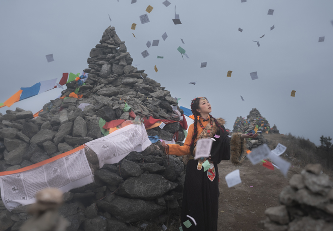 身穿藏服的姑娘站在高山之巔,手持轉(zhuǎn)經(jīng)筒,目視遠方,似在祈禱些什么,身后是五顏六色的風(fēng)馬經(jīng)幡……這樣場景不是出自四川、西藏,而是在近日的永嘉南正尖的山頂。