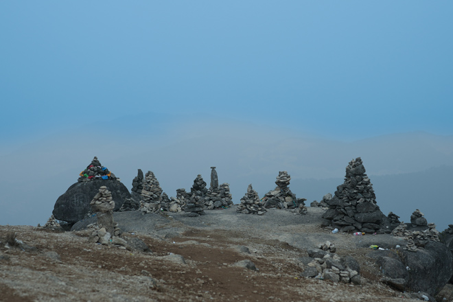 然而今年再次登頂南正尖時,他還是被驚到了!霸瓉碇挥兴奈鍌瑪尼堆,在五六年間突然增加百來個之多,大者如垛,小的只有三片疊置的石頭,你幾乎在地上已經(jīng)撿不到凌亂的石子了。再加上人們自發(fā)帶來五顏六色的經(jīng)幡,這里儼然成‘溫州小西藏’!苯鹦の浔硎,可能是疫情影響,對西藏有情結(jié)或者熱愛旅游的人,選擇登頂南正尖作為替代品。