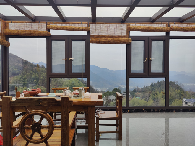 除了楊梅基地,李世秒還配套建設(shè)了農(nóng)家樂和兩幢民宿!俺燥埖牡胤讲畈欢嗫梢匀菁{兩百來人,房間的話這邊樓上有13個(gè),另一邊的獨(dú)棟有9個(gè)房間,每間都有大面積的觀景落地窗!