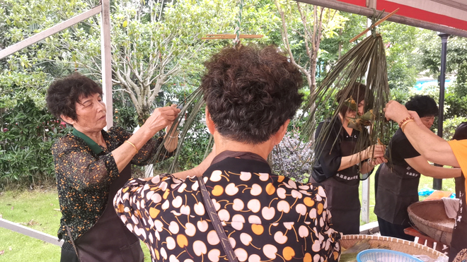 6月21日上午8點(diǎn)不到,烏牛綜合文化站廣場(chǎng)前已經(jīng)聚集起不少群眾,大家在這里吃湯圓、嘗粉干、包粽子、做香囊,一派熱鬧景象;顒(dòng)現(xiàn)場(chǎng)還吸引了30余名志愿者,他們?cè)缭鐏?lái)到現(xiàn)場(chǎng),準(zhǔn)備食材,維持現(xiàn)場(chǎng)秩序。