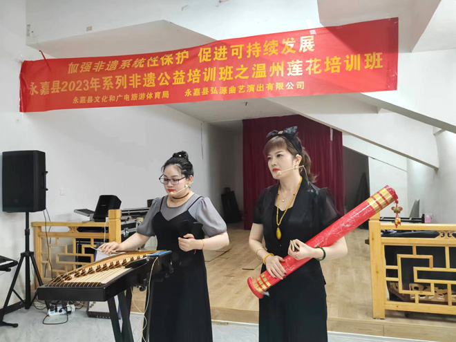 金海雙和廖曉飛兩年前參加永嘉縣文化和廣電旅游體育局開(kāi)辦的溫州蓮花公益培訓(xùn)班,和另外兩位優(yōu)秀學(xué)員一起被主辦單位接收作為永嘉縣“國(guó)家級(jí)非遺項(xiàng)目溫州蓮花”和“省級(jí)非遺項(xiàng)目永嘉花鼓”新一批的“師帶徒”傳承人進(jìn)行培養(yǎng),并邀請(qǐng)錢(qián)雷雷老師作為他們的指導(dǎo)師,并與他們簽約了傳承協(xié)議。