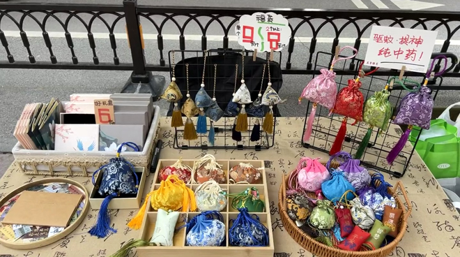 端午風(fēng)俗,除了吃粽子,還有佩香囊、掛艾草、驅(qū)五毒。香囊、荷包、蛋袋等節(jié)日元素濃郁的周邊產(chǎn)品,也成為端午經(jīng)濟(jì)的重要組成部分。