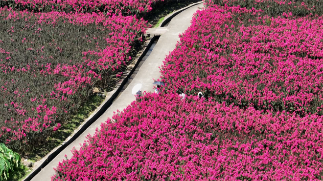 在夏日的陽光下,只見紫薇花枝繁葉茂,花團錦簇,朵朵相擁,開得熱烈而奔放,絢爛繽紛。置身其中,仿佛徜徉在一片玫紅色的海洋,形成一幅醉人的秀美畫卷,引來村民和游客前來觀賞。“這兩天過來拍照的人很多,我正好路過也過來拍一下照!毕洗宕迕駞渭t飛說道。“我是在小紅書上刷到這片花海的,專程過來拍照片,這么大片的花海,視覺沖擊力非常強,尤其在遠山的映襯下就顯得更加好看了!眮碜院贾莸挠慰完惻空f。
