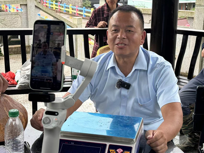 “我普通話不太會(huì)說,只能靠陳書記幫我翻譯,和網(wǎng)友商量?jī)r(jià)格!贝迕裰旄鹉樕下詭呃,用方言與記者解釋道!按髬專芯W(wǎng)友問你今天帶來的這個(gè)苦櫧豆腐干是怎么做的?”陳文廣接過村民的農(nóng)貨,充當(dāng)起村民和網(wǎng)友的“翻譯員”,向網(wǎng)友介紹農(nóng)貨的制作過程、烹飪方法,同時(shí)向村民翻譯網(wǎng)友的問題!芭笥褌儯髬屨f首先苦櫧把它剝出來,再把它磨成粉,之后做成苦櫧豆腐,最后曬干就是現(xiàn)在這樣的成品,一片一片的,這都是她親自做的,沒有打農(nóng)藥,綠色食品!标愇膹V耐心傾聽村民說的每一句方言,生怕落下關(guān)鍵信息,同時(shí)也為網(wǎng)友答疑解惑。