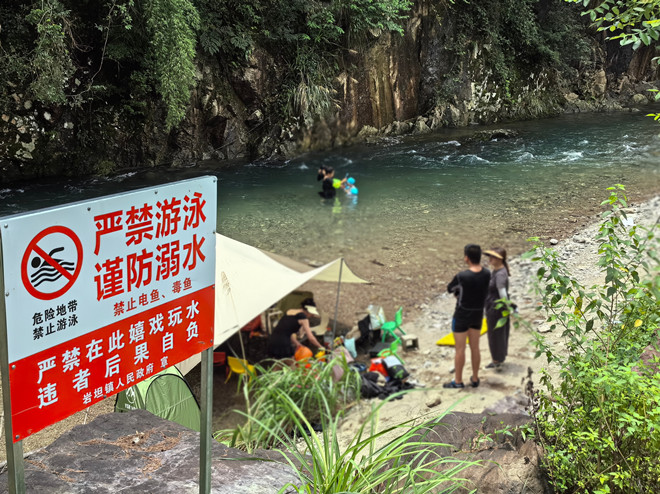 在小紅書、抖音等網(wǎng)絡(luò)平臺(tái)上,景泉村蜿蜒清澈的溪流被冠以“天然泳池”“露營(yíng)圣地”之名,吸引著源源不斷的游客驅(qū)車前往,甚至有許多外地游客慕名而來。正值中午,景泉村溪流沿岸已是一片熱鬧景象:三四頂帳篷隨意搭建在溪流邊。即便路邊立著一塊紅白相間的醒目警示牌,清晰標(biāo)注“嚴(yán)禁游泳,謹(jǐn)防溺水”,仍有幾組家庭帶著孩子在溪中戲水,其中最小的孩子看起來才五六歲。