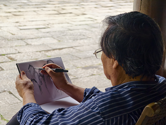 不遠(yuǎn)處,中國(guó)美術(shù)家協(xié)會(huì)民族美術(shù)藝委會(huì)副主任鄧維東則以流暢的線條勾勒出陡峭崖壁與幽深峽谷。他說(shuō):“楠溪江不僅風(fēng)景秀美,更承載著永嘉深厚的歷史文脈,無(wú)數(shù)詩(shī)詞名篇在此誕生。此次活動(dòng)不僅是一次寫(xiě)生,更是東西方藝術(shù)理念的有效碰撞,對(duì)促進(jìn)兩國(guó)文化交流意義深遠(yuǎn)!