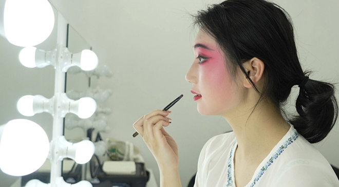 下午5點,距離正式演出還有兩小時,化妝間已是一派忙碌景象。鏡前排列著各色油彩與妝具,演員們靜坐勾畫,素顏漸被戲曲的“筋骨”與神韻覆蓋。青年演員徐涵瑞坦言,這是她首次參與劇團傳統(tǒng)大戲的演出,“下午三點就開始準備了,雖然時間有點早,但是既緊張又激動,所以就想努力呈現(xiàn)最好的自己!睂λ,每一次登臺都是珍貴的歷練。