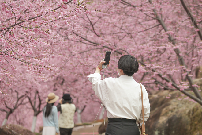 “每年花開(kāi)時(shí)節(jié),電話便忙得發(fā)燙,一天最多四五百個(gè),充電寶得時(shí)刻揣在身邊,許多電話都是希望免費(fèi)入園的!敝芮艺劶按颂,眉眼間漾開(kāi)淡淡的笑意,語(yǔ)氣里沒(méi)有半分抱怨,只有歷經(jīng)歲月沉淀后的欣慰與從容。十年櫛風(fēng)沐雨,十年默默耕耘,他滿頭青絲染成霜雪,換來(lái)漫山遍野的櫻花爛漫。每到花期,千枝綴彩、萬(wàn)朵爭(zhēng)艷,如云似霞的櫻花,吸引著全國(guó)各地的游客慕名而來(lái),單日客流峰值突破萬(wàn)人,旅游大巴如長(zhǎng)龍般蜿蜒在雁楠公路上,昔日寂靜荒涼的荒山,如今人聲鼎沸、熱鬧非凡,每一寸土地,都洋溢著生機(jī)與希望。